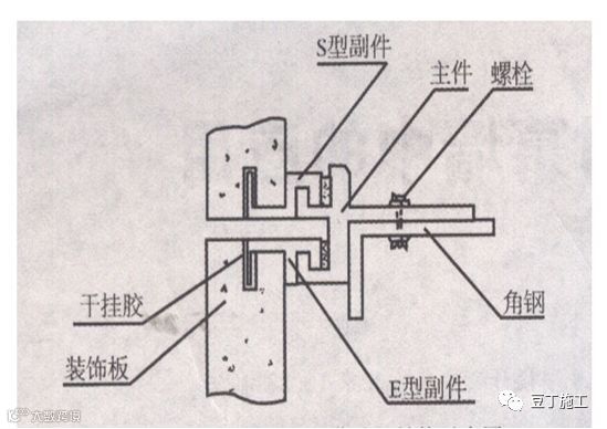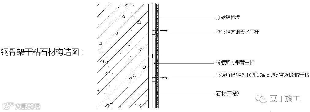 骨架干粘石材采用埋板与基层墙面连接,竖向龙骨和横向龙骨均采用方钢做成龙骨架与埋板焊接,石材通过环氧树脂A、B双组份工程胶与横龙骨上的短角钢或角码进行粘贴以达到装饰效果。