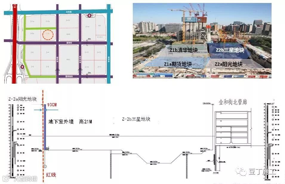 北京市CBD核心区Z2b地块四周均是在建项目,场地狭小,在建项目之间限制性大,尤其是西侧地下室外墙,距红线只有10cm,且红线外侧即为阳光保险在施地块,使得西侧地下室21m高外墙无法按照现有施工方法进行结构施工,故结合建筑工业化和绿色建造的施工理念,研发PCF单侧支模技术,解决现有难题。接下来我简称PCF单侧支模为PC板