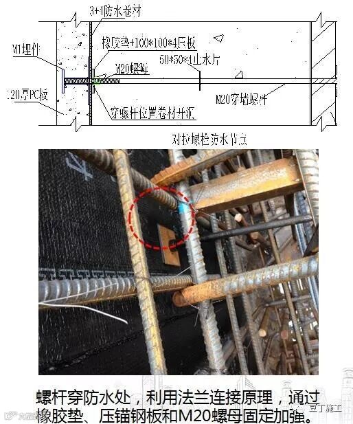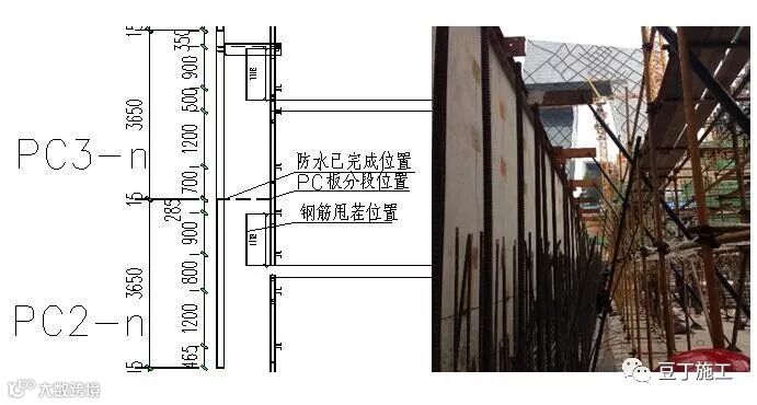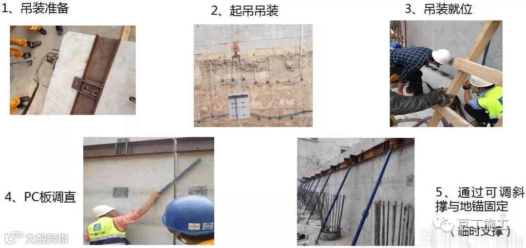 5、通过可调斜撑与地锚固定:首先安装最底层首块PC板,考虑外墙边距工程桩仅300mm,为保证PC板的固定,在其下部施工条形基础。然后安装第一块PC板并施工临时支撑,临时支撑底部通过M18螺栓与基础或楼板预埋埋件固定,上部通过M18螺栓和配套螺母与槽钢固定。