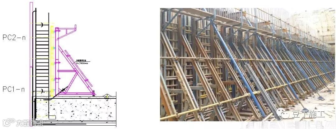 具体做法:将2~3块PC板用原临时固定25#C槽钢连成一体,然后用L90角钢一头与一体槽钢连接固定,另一头与桩头钢筋锚板焊接固定,然后拆除临时支撑杆间。