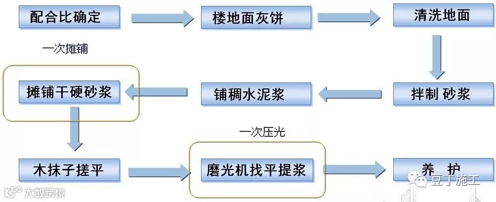 首先按水泥砂子1:3的配合比在搅拌机中对水泥、砂子进行干搅拌,待搅拌均匀后,适量加水继续进行搅拌,使水泥、砂子在手握成团状的潮湿状态后备用;根据经验,判定干硬砂浆的标准为“手握成团,落地成花”的潮湿状态为最好,砂浆太湿或太干都不适合提浆硬化。先做灰饼;提前一天清洗地面,第二天在清洗干净的地面上用较粘稠的水泥浆进行满铺,地面要潮湿但不见明水,水泥浆的厚度保持为30mm—50mm;然后大面积铺设干硬性水泥砂浆,用木抹子拍打搓平;搓平之后马上用磨光机磨光提浆(或多个工人迅速用铁抹子收面),基本不需表面洒水,一直至提浆到位,一次成活,若需毛面,可以用扫把朝一个方向轻扫出纹理;洒水养护:养护时间相对提前。一半来说,夏天 3 小时以后便可以养护,春秋6/7 个小时即可开始养护。不得少于7d。