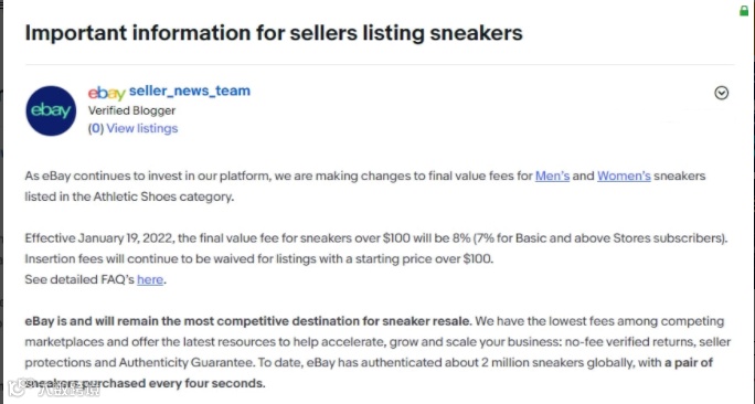 自 2022 年 1 月 19 日起,超过 100 美元的运动鞋的最终价值费用将为 8%(Basic 及以上商店订阅者为 7%)。对于起价超过 100 美元的商品,将继续免收插入费。