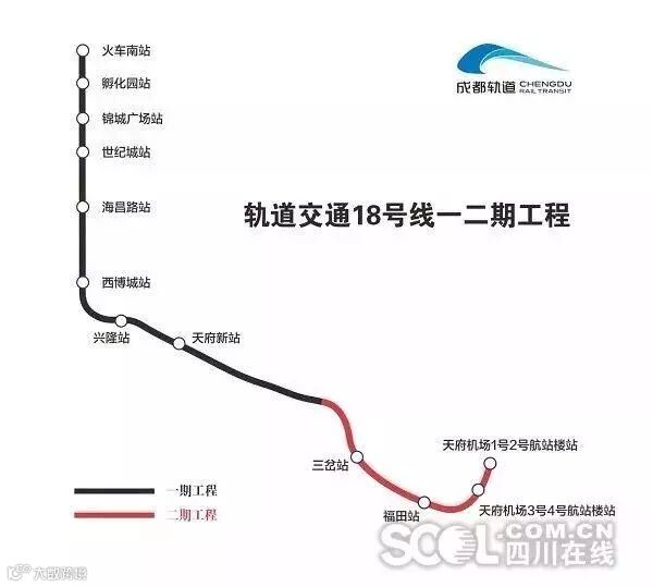 起于火车北站正下方,终于火车南站(不含),连接成都中心城区、天府新区以及新机场,线路全长16.715km,设车站6座。计划于2019年10月开工,2024年10建成运营。