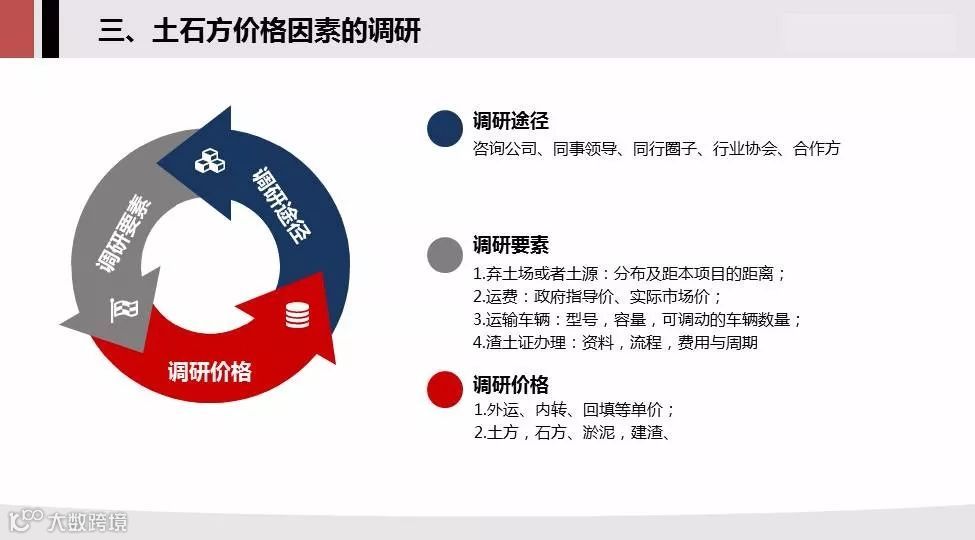 C、市场调研:富余还是稀缺,垄断化还是市场化,土源或弃土点距离、周边项目单价水平;