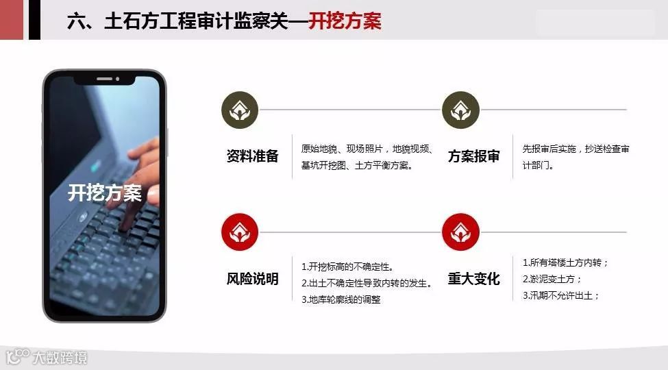 6.土石方监察审计关:测绘方式,原始地貌,开挖方案,阐述了三个方面的注意事项