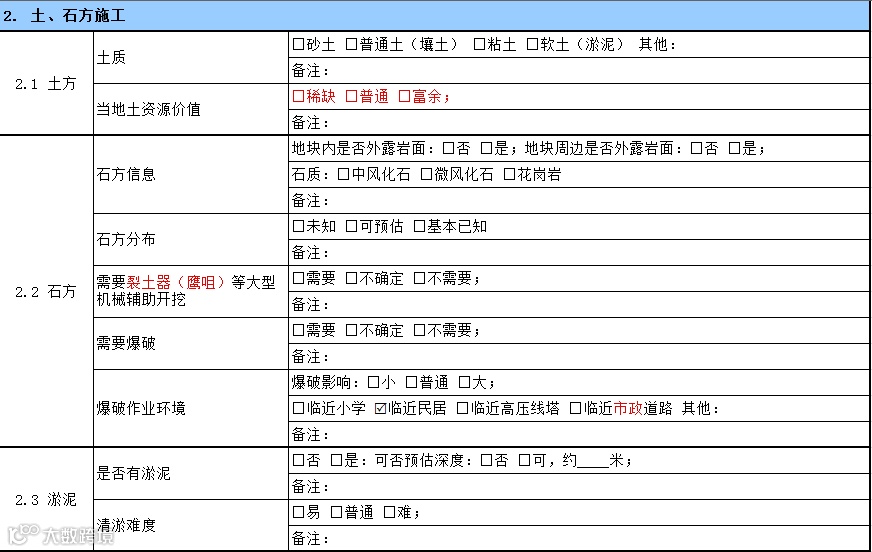 投资拓展小组人员只需要根据踏勘清单一一完成相关要素的调研,避免人为经验,缺漏相关调研因素,某标杆企业的“土方踏勘清单样表”如下: