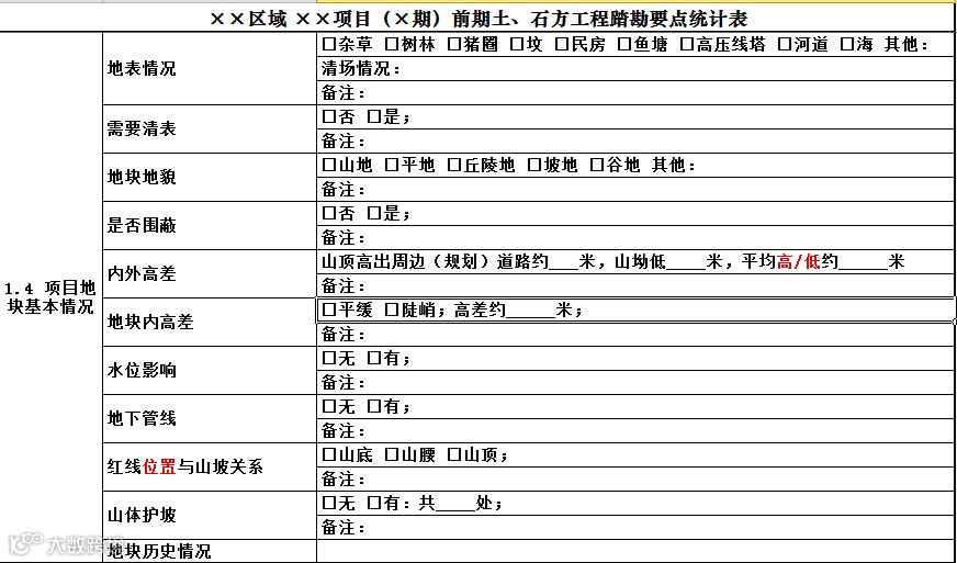 由于土地市场的狂热,为了能够让投资拓展小组人员能够快速而准确的对土石方工程完成踏勘,应针对此项工程制作专门的“土方踏勘清单”。