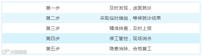 ▪ 建立疫情应急处置机制。现场一旦发现员工有发热、咳嗽等症状时,严格按照《关于建设工程项目防控新型冠状病毒感染的肺炎疫情应急处置流程》中的“五步工作法”要求,第一时间启动应急处置流程,及时妥善处理。