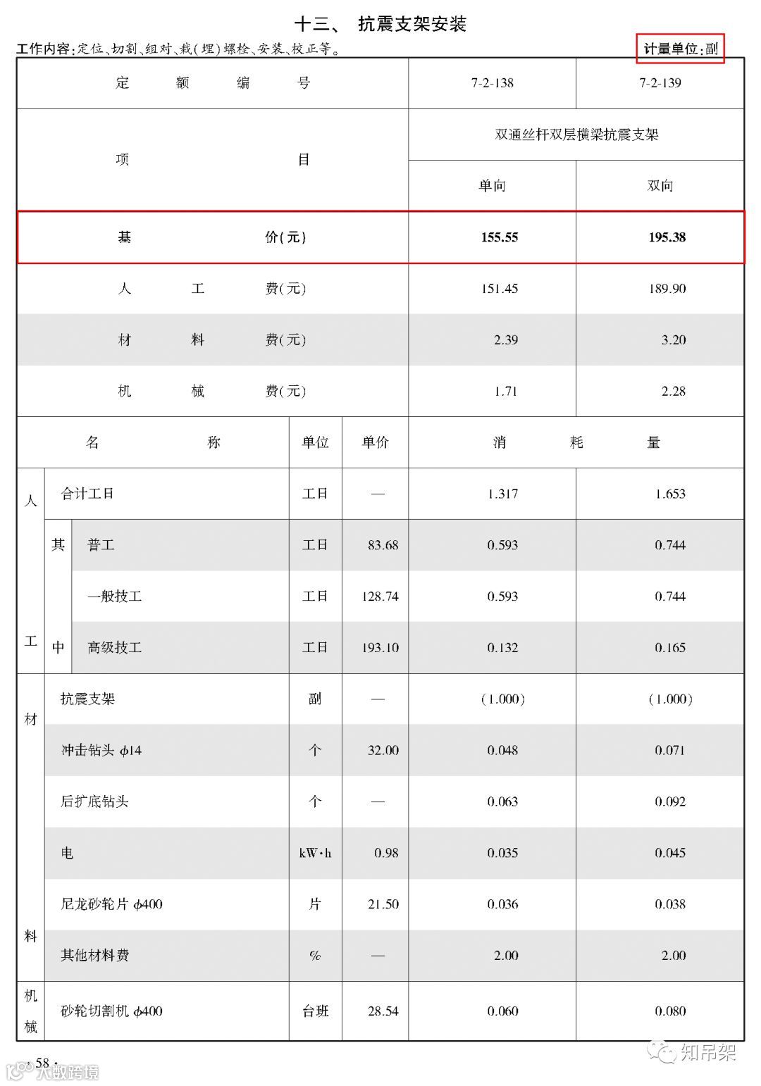第七册通风空调安装工程中,抗震支架安装工作内容包括:定位、切割、组对、载(埋)螺栓、安装、校正等。对于双通丝杆双层横梁风管抗震支架,拟按照单向抗震支架基价155.55元/副,双向抗震支架基价195.38元/副。点击>>工程资料免费下载