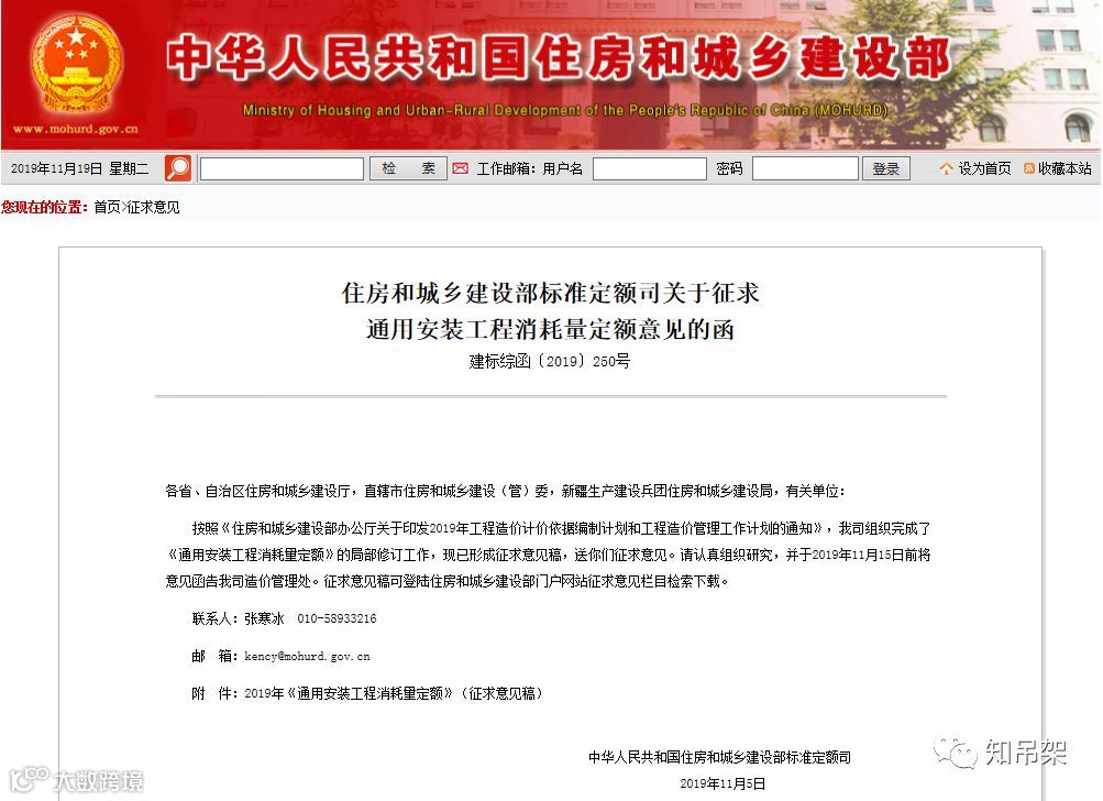 近日,住房和城乡建设部发布《住房和城乡建设部标准定额司关于征求通用安装工程消耗量定额意见的函》(建标综函〔2019〕250号)。