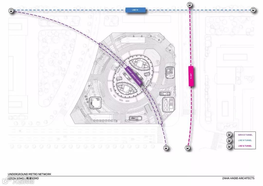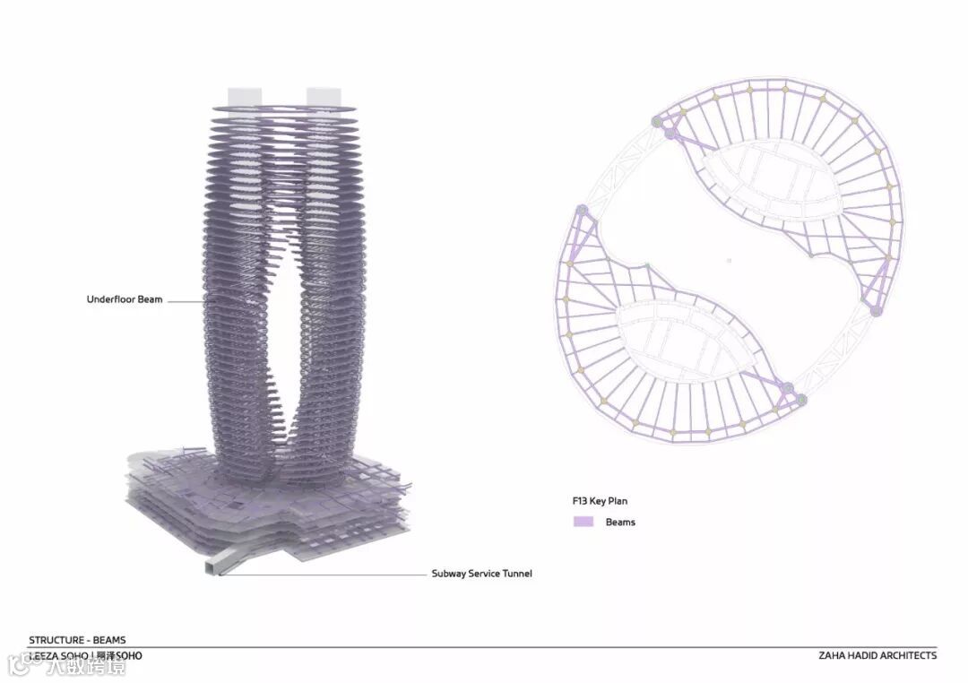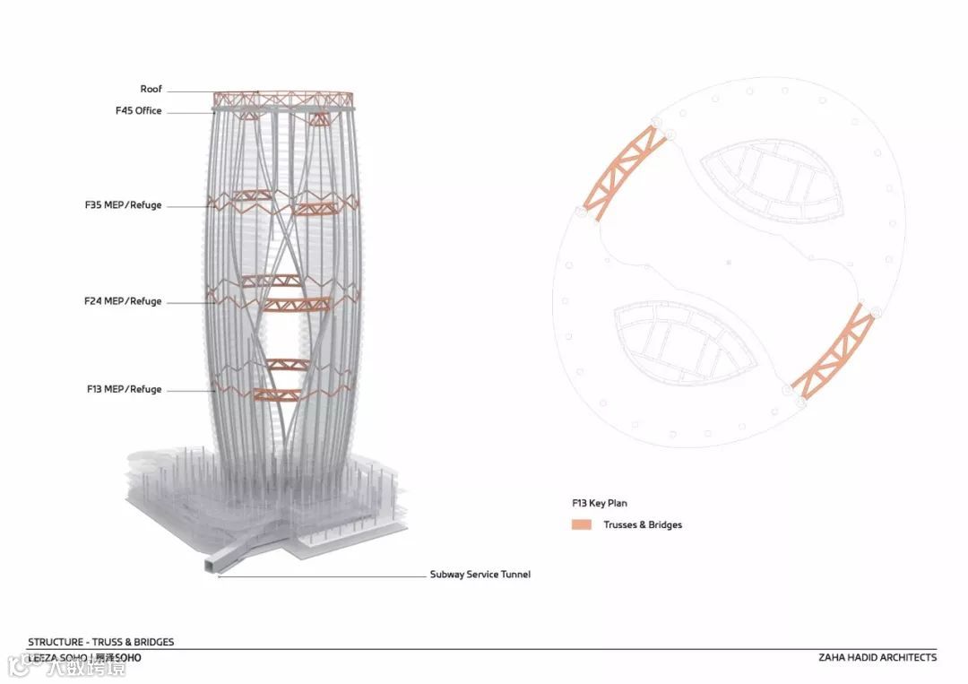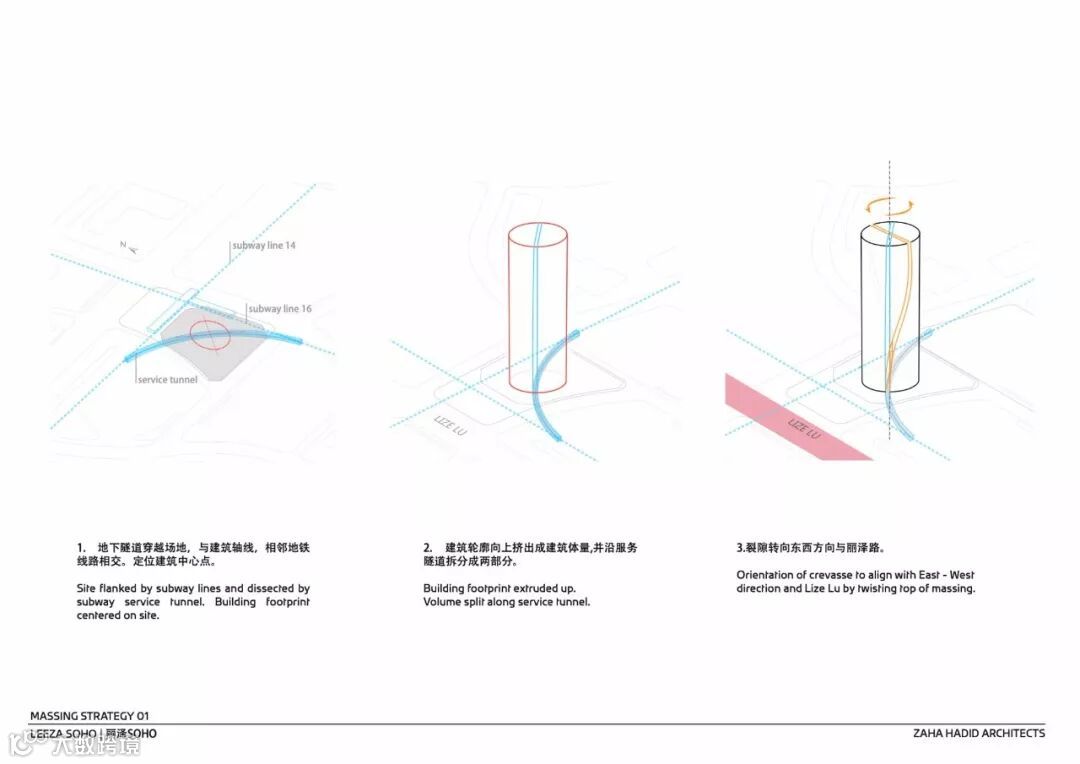 由于丽泽SOHO地块下方的地铁连通线将整个地块一分为二,因此建筑师通过DNA双螺旋结构的形式创造性地设计解决了这一难题。