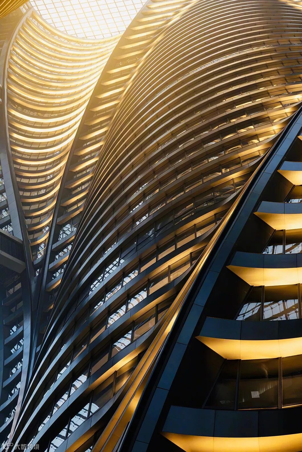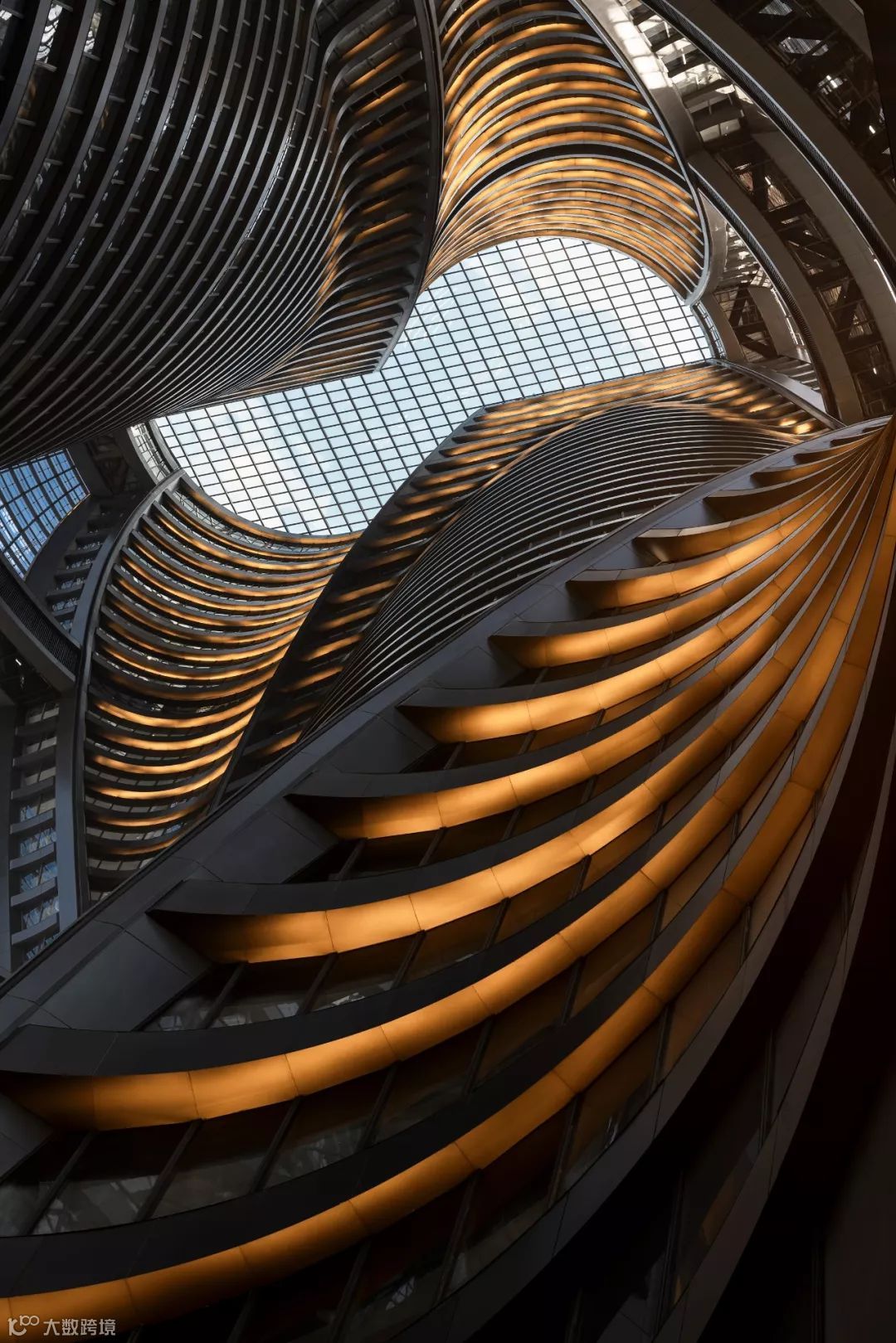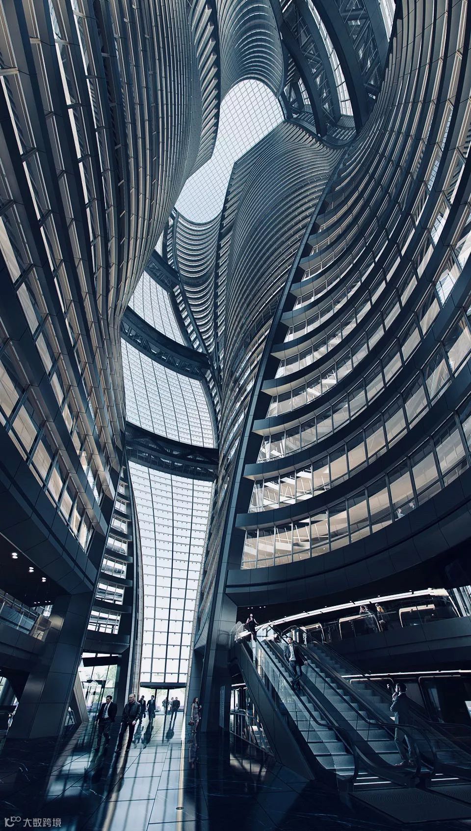 左右两个单塔建筑如DNA双螺旋结构盘旋而上,各层平面逐层旋转至45度,围绕成一座高达194.15米的世界最高中庭。