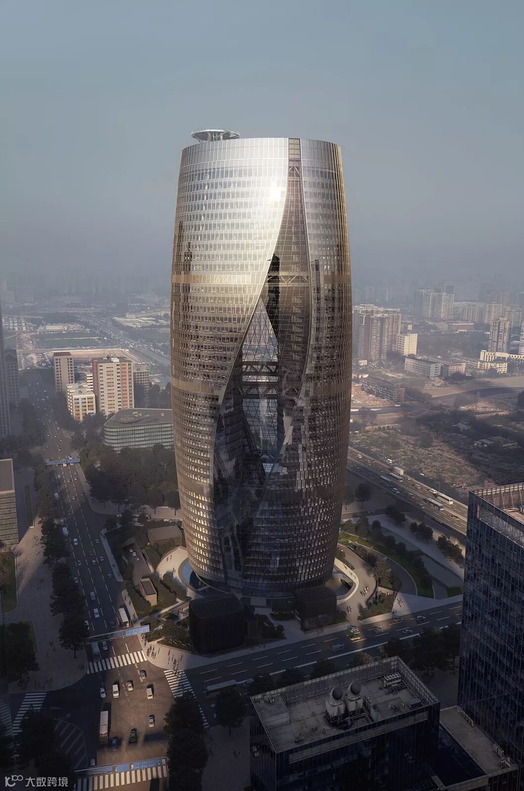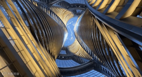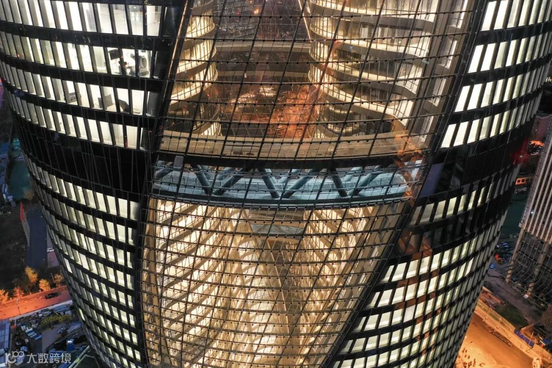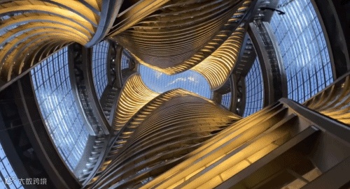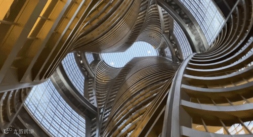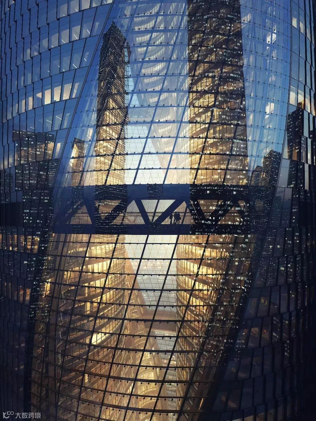 左右两个单塔建筑如DNA双螺旋结构盘旋而上,各层平面逐层旋转至45度,围绕成一座高达194.15米的世界最高中庭。