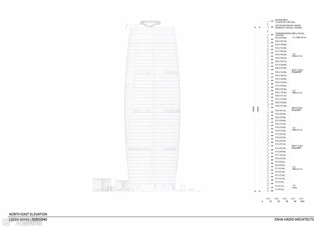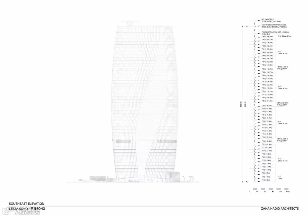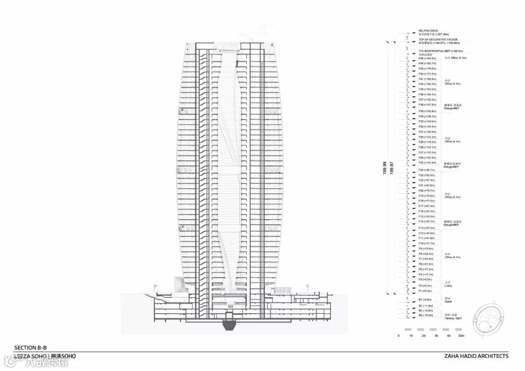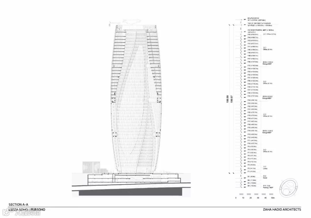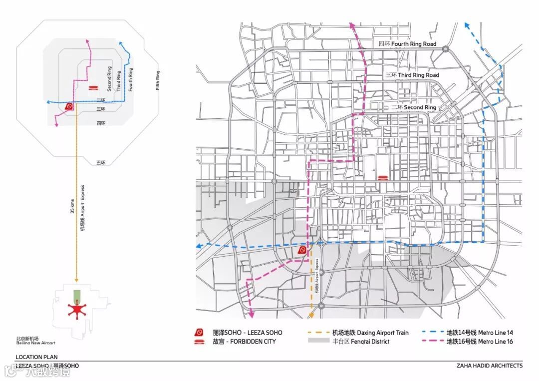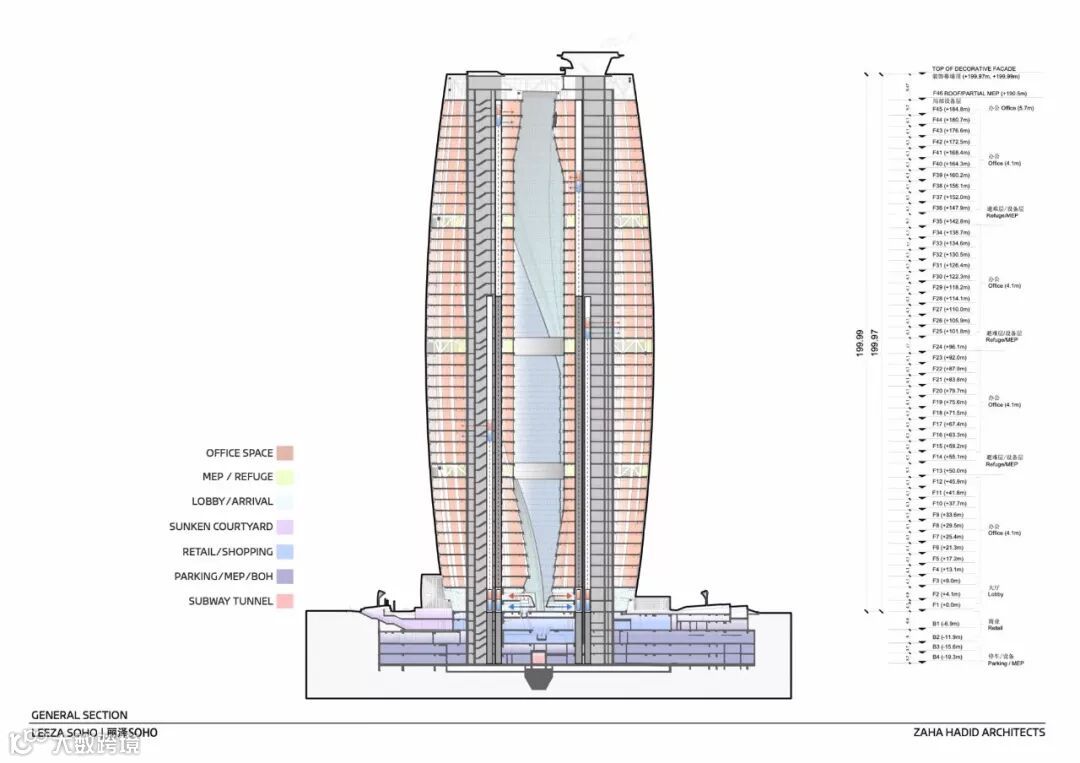 这座45层高的172800平方米的塔楼满足了北京中小企业对灵活高效的甲级办公空间的需求。毗邻商业区的火车站,位于北京地铁网络正在建设的五条新线路的交汇处,一条地铁隧道将丽泽SOHO地块沿对角线分割成两部分。