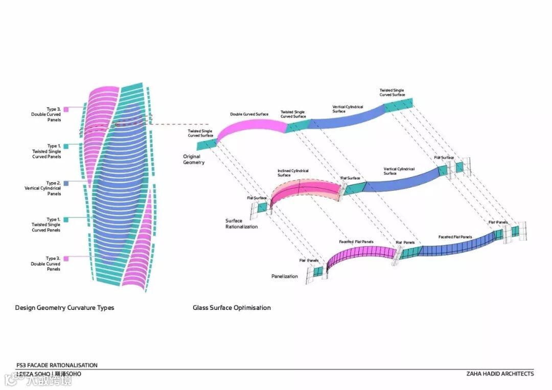 丽泽SOHO外立面由4000多块异形单元体玻璃构成,安装时需要按照方向进行,且不尽相同的每块玻璃之间,夹角都是经过精准计算。