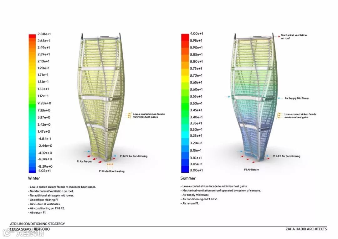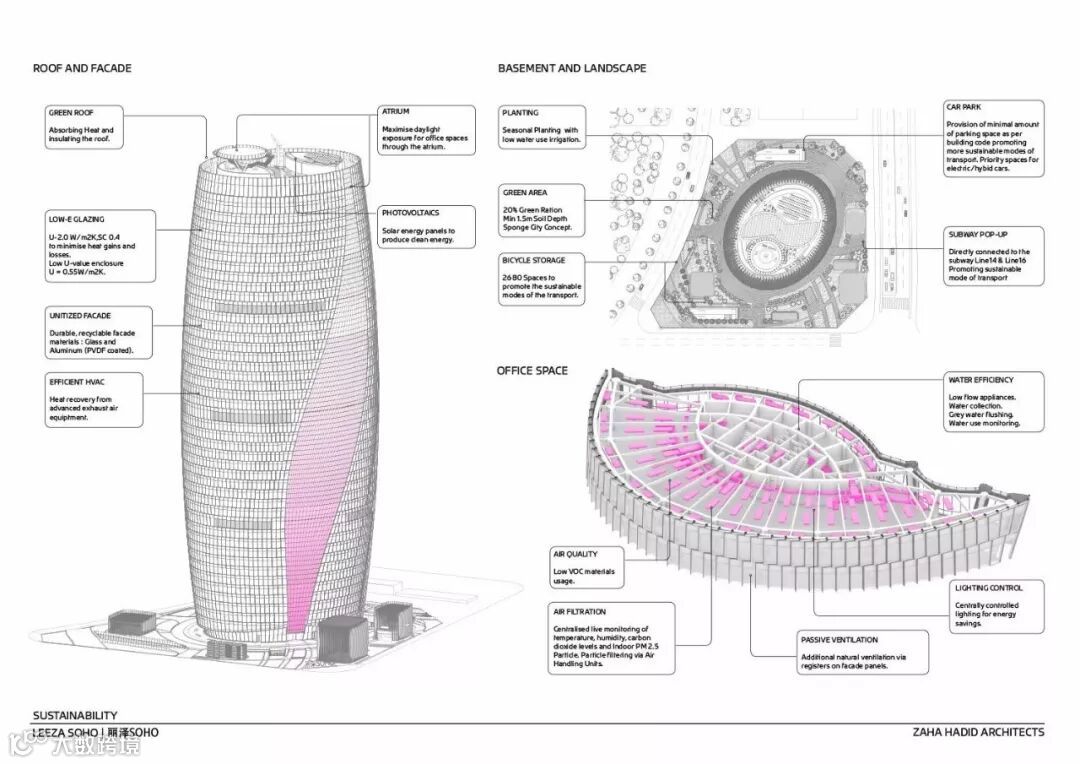 扎哈·哈迪德建筑师事务所和中国SOHO在设计、施工管理和建筑运营方面走在3D建筑信息建模(BIM)的最前沿,已实施了成熟的技术,他们在四次合作中都采用了行之有效的技术来降低能耗和排放,北京和上海共有1500万平方英尺(140万平方米)的混合用途城市空间。