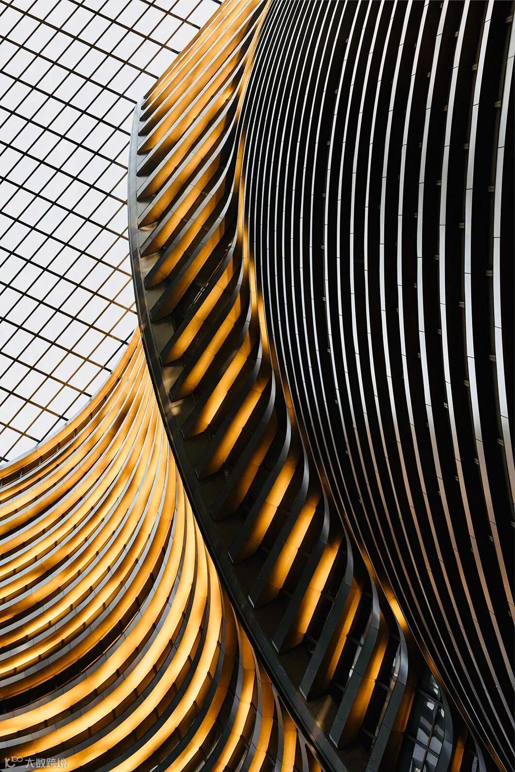两个单塔的流线形反对称曲面犹如两条钢铁巨龙蜿蜒,让人感觉像置身于科幻大片之中。