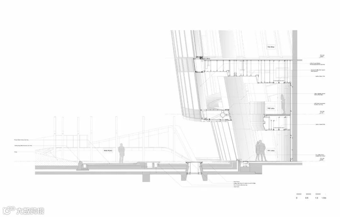建筑底部中庭与地铁隧道的轴线对齐,随着建筑主体的上升,中庭扭转 45 度,使较高楼层与城市的历史悠久的南北和东西轴线方向形成一致。