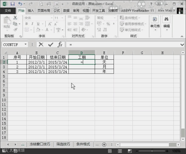 笔者先简单解释下以下表格中的单元格D2输入的公式“=DATEDIF(B2,C2,"d")“前两个参数分别是开始日期和结束日期,第三个参数"d"是计算天数的参数,也可以改成"m"(计算月份)和"y"(计算年份)。