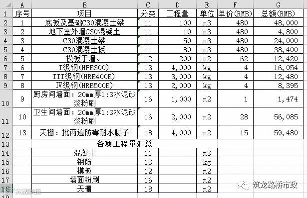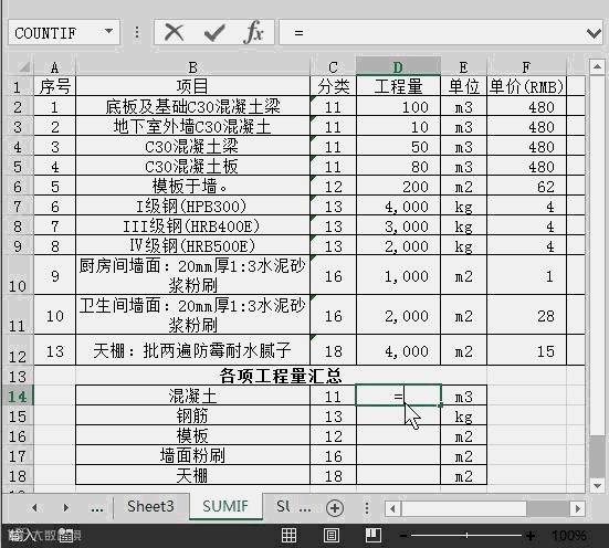 大家在统计工程量的各项技术指标时,往往先需要汇总各项工程量(如混凝土的总和),该项工作特别麻烦,还容易出错,有什么方法可以一步到位呢?常用函数Sumif可以帮大家解决这个问题。案例如下: