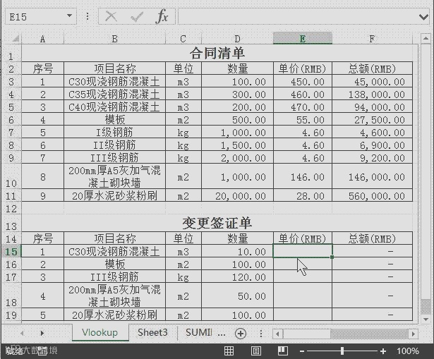 例如:施工单位在进行投标报价时,有很多单体工程分不同的清单表格进行报价,而其实大部分的清单项目是相同的,在完成第一个单体工程的投标报价后,再运用此函数在其他单体清单中,可达到了事半功倍。又如某个变更签证要参照工程合同(工程量清单为计价合同)的相应清单项目进行套价: