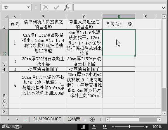 在平时的造价工作中,大家一定会碰到这样一个问题,在您已经编制了工程量清单的格式(包括清单描述、单位等),需要其他算量同事填写工程量。但他们完成填写工程量的表格是否会调整或不小心修改过原表格内容(如清单描述或单位等),你要是以一一核对或复核一下,那简直太费时间了。其实Exact函数火眼金睛,很快识别出其中的差异。比如下表中的第2、3行的B、C列的内容已有差异了,请看动态演示: