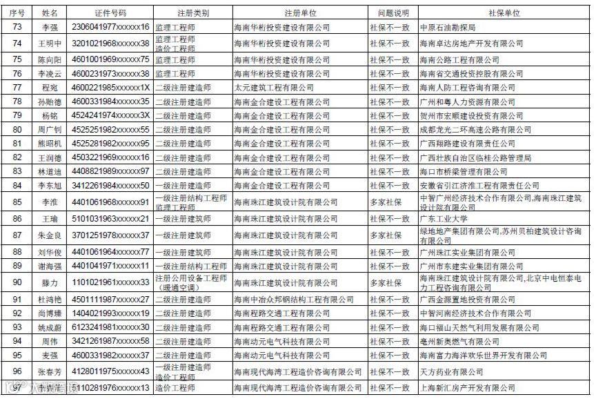 72家单位、225名注册工程师社保与注册关系不一致或多家社保; -