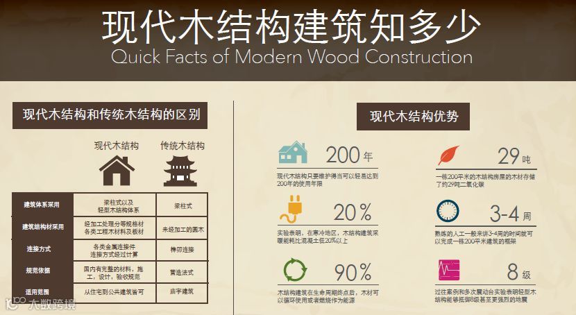 尽管在工程卓越方面取得了巨大进步,但今天仍在使用木材的众多原因之一是其耐用性和安全性。木建筑重量是混凝土的七分之一,在地震等灾害中,质量轻意味着收到的地震力就小。同时木材是具有弹性的材料,在建筑物框架发生摇晃的时候,这种柔性结构能够很好的吸收地震力,保证建筑框架的安全性。