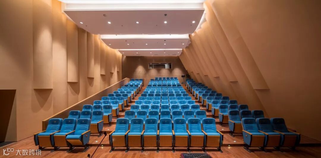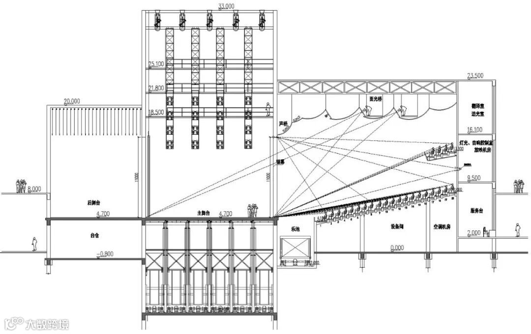 在视觉设计上,楼座的最远地方座位是26米不到33米,向下倾斜20度,池座位俯角小于35度,放映视角是可控的,池座位、楼座舞台夹角控制,舞台中心看观众席角度大于80度,第一个表面光桥夹角是50度灯光控制。