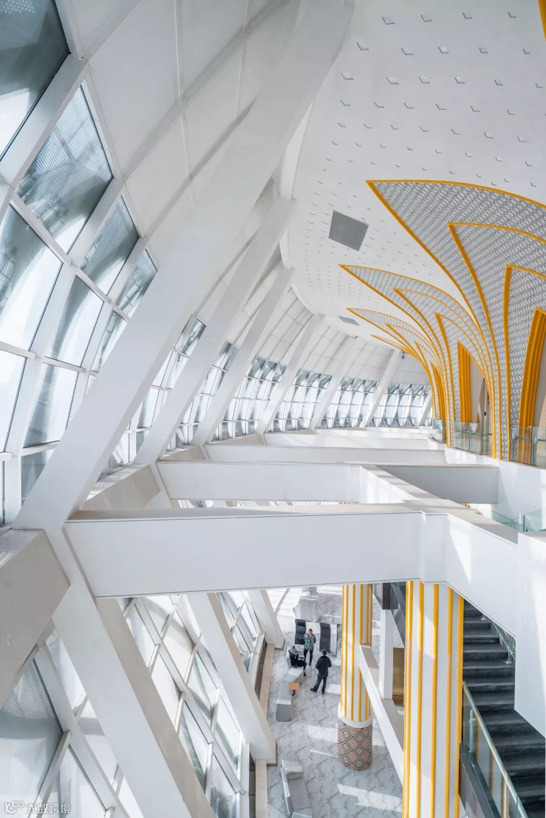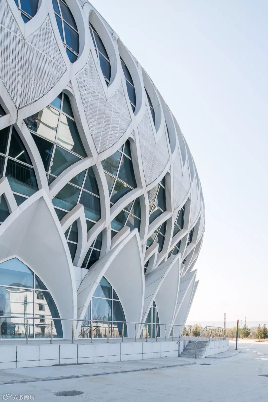 壳体结构、幕墙结构与幕墙肌理融为一体,节约了大量成本。因此,整个立面内外强大的通透性外壳使得建筑从“不透”到“通透”的顶部成为可能,再加上立面“雪山白”的色彩选择,使得原本雕塑的穹顶形状变得抽象。