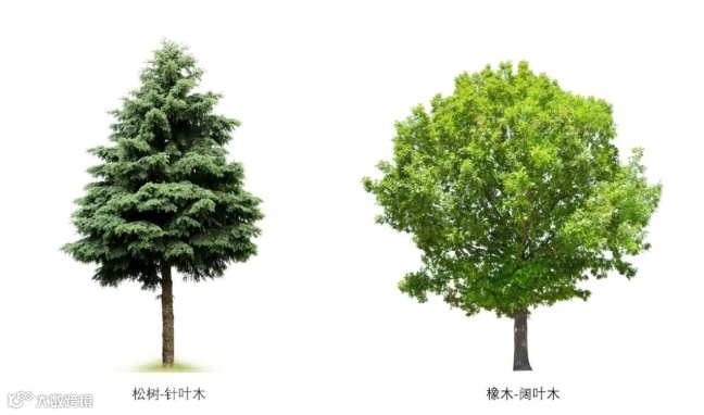 软木来自常绿的针叶林,如左图的松树,树叶细长如针,包括雪松,柏树,冷杉,和云杉等。硬木如右图橡树这类阔叶树,它的叶子具有扁平、较宽阔的叶片,还包括白蜡树,柚木和胡桃木等。