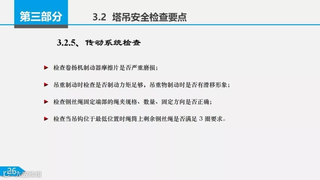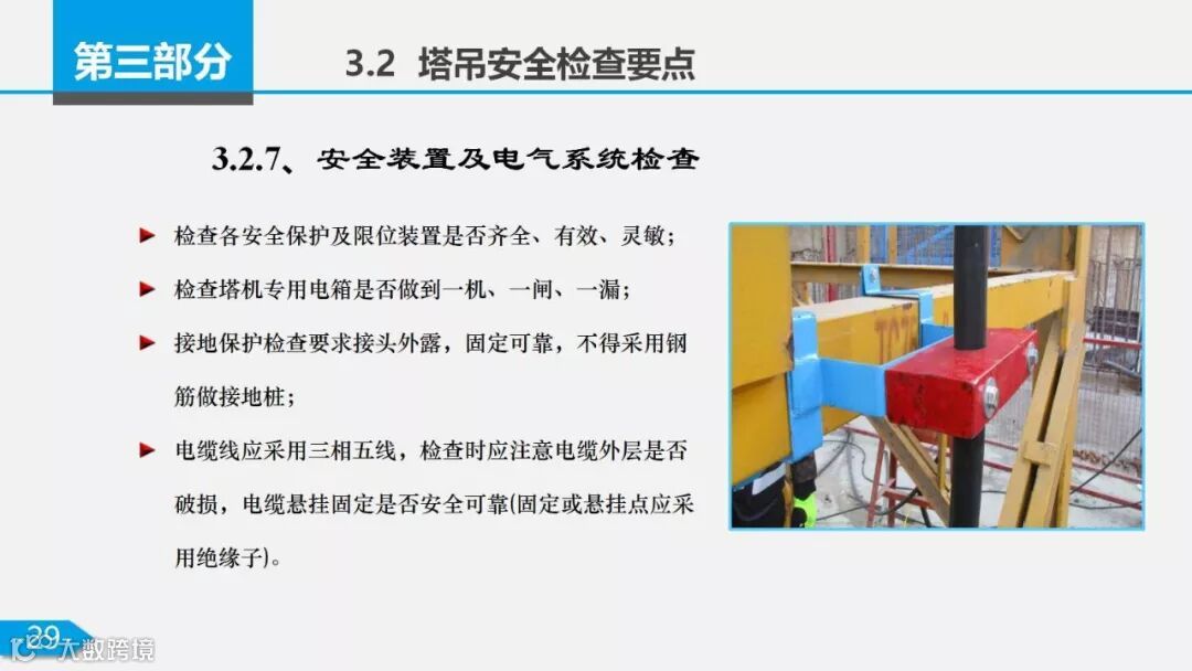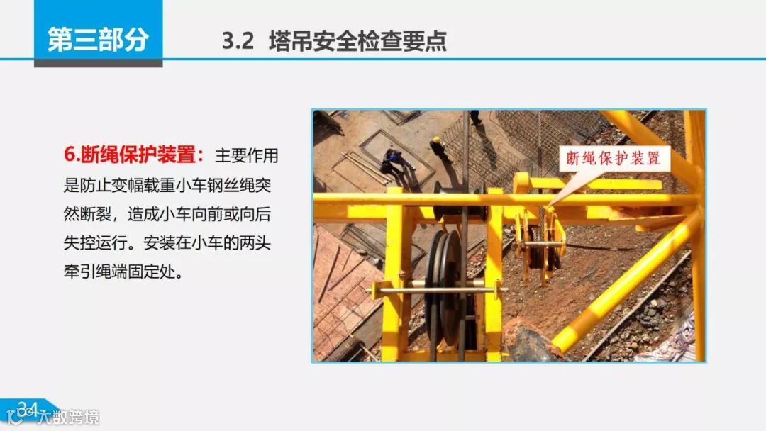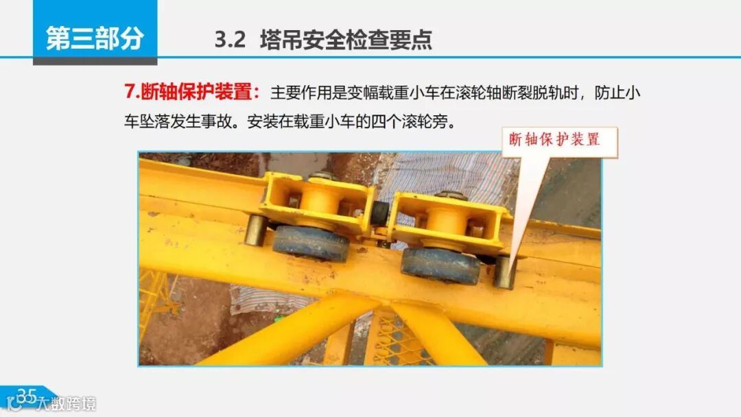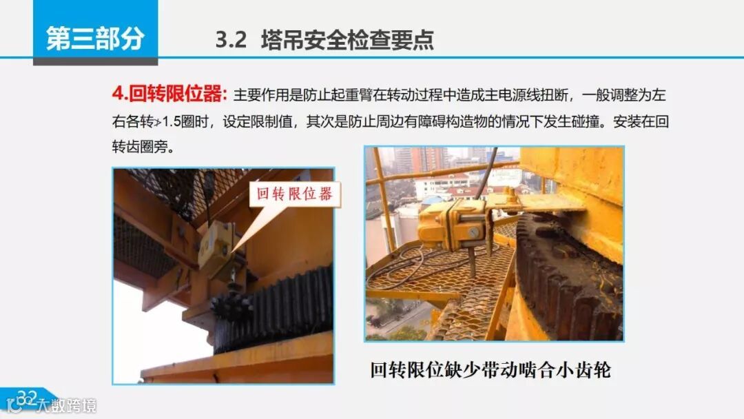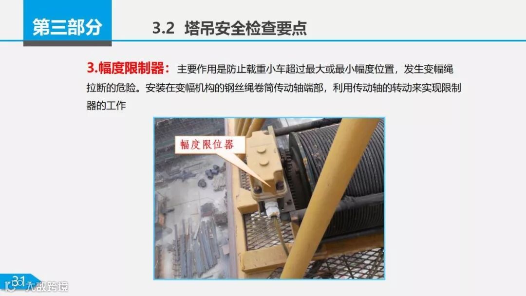 6.对塔吊实体方面应重点查:力矩限位、超高限位、变幅限位、回转限位、吊钩保险、钢丝绳卷桶及小车断绳等保险装置、附墙装置、连接紧固件螺栓销轴,以及主要受力构件是否变形开裂、焊接部位是否脱焊、钢丝绳断丝断股是否达到报废标准等重大安全隐患。