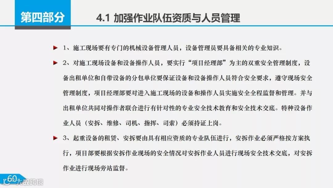 4.现场安全保护工作及相关人员是否到位,是否进行交底:安拆单位管理人员是否到岗履责;安拆现场是否设置警戒区,并由专人负责安保工作;安拆人员是否按要求配备安全防护用品;施工单位设备管理人员、现场监理人员是否到现场进行检查、监理;安拆程序是否符合安拆方案及说明书要求。