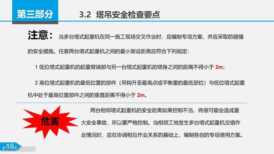 三是防碰撞措施是否合理:任何两台塔吊之间距离是否大于2米,严禁塔吊起重臂直接碰撞对方塔吊标准节,多塔作业回转半径内有障碍物与塔吊干涉的塔机是否有经审批的防碰撞措施。