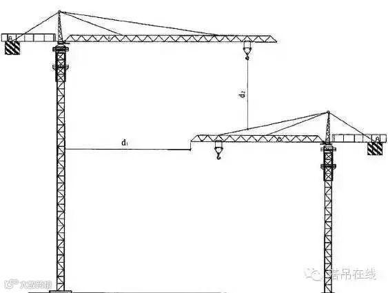 两台塔式起重机之间的最小架设距离应保证处于低位塔式起重机的起重臂端部与另一台塔式起重机的塔身之间至少有2m(d1) 的距离;处于高位塔式起重机的最低位置的部件(吊钩升至最高点或平衡重的最低部位)与低位塔式起重机中处于最高位置部件之间的垂直距离不应小于2m (d2)。