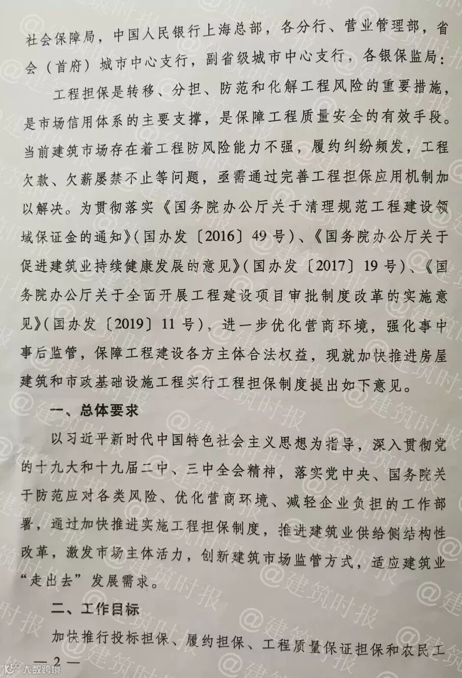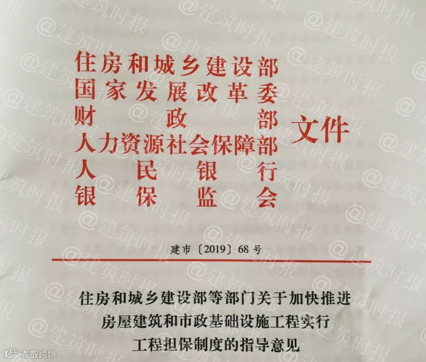 日前,住建部联合发改委、财政部、人社部、人民银行、银保监会共同发文(建市【2019】68号)加快推进房屋建筑和市政基础设施工程实行工程担保制度。
