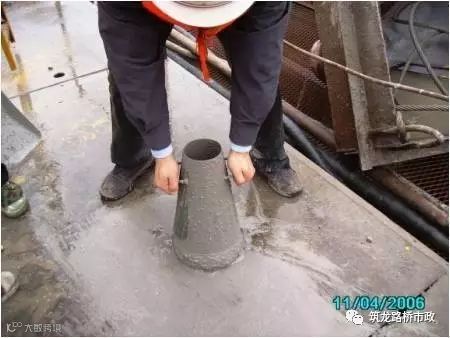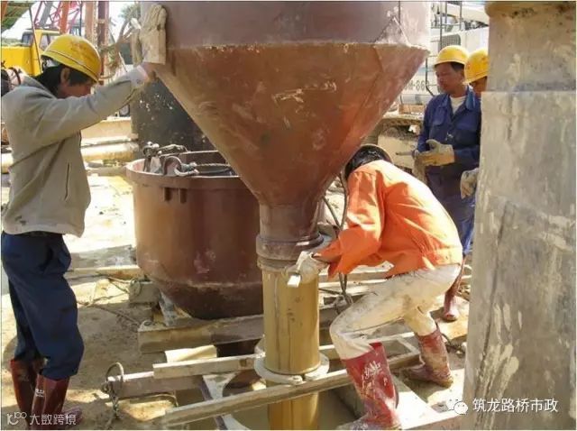 在灌注接近结束时,由于导管混凝土柱高度减小,压力降低,而导管管外的泥浆稠度增加,如出现混凝土面上升困难时,可在孔内加水稀释泥浆,并掏出部分沉淀土,使灌注工作顺利进行
