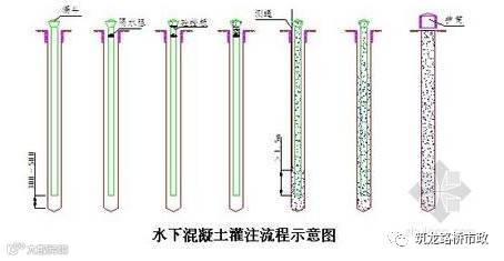水下灌注混凝土应连续进行,严禁中途停顿。导管在混凝土中埋入深度一般为2~4米,在任何情况下不得小于1米或大于6米。