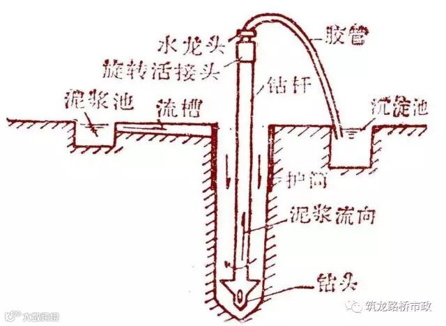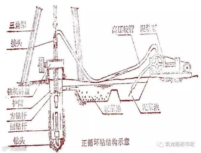 正循环是用泥浆泵将泥浆以一定压力通过空心钻杆顶部,从钻杆底部喷出,底部的钻锥在旋转时将土壤搅松成为钻渣,被泥浆悬浮,随泥浆上升而溢出流至孔外的泥浆槽,经过沉淀池中沉淀净化,再循环使用。