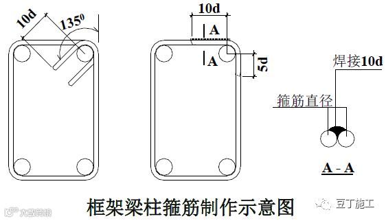 1)框架梁、柱箍筋应制作 135°弯头;当梁、柱纵筋较密,无法制作 135°弯头时,应做成焊接封闭环式箍筋,不得焊伤箍筋。