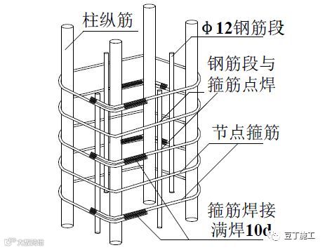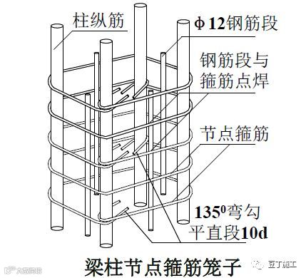 2)梁柱节点箍筋必须按设计要求的间距加密箍筋。当现场安装有困难时,可在柱每侧设置不少于 1根ф12 钢筋段与节点箍筋点焊制成钢筋笼,随绑扎后的梁筋一齐下沉至设计位置,如右图所示。