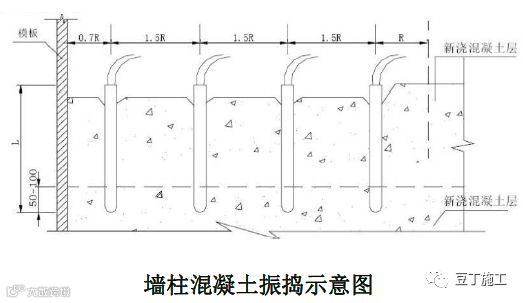 (3)振捣棒移动间距应小于 500mm,每个振点的延续时间以表面呈现浮浆为准,为使上下层混凝土结合成整体,振捣器应插入下层混凝土 50mm。振捣时注意钢筋密集及洞口部位,防止出现漏捣,必须在洞口两侧同时振捣,下料高度也要大体一致。大洞口的洞底模板应开口,并在开口处振捣。