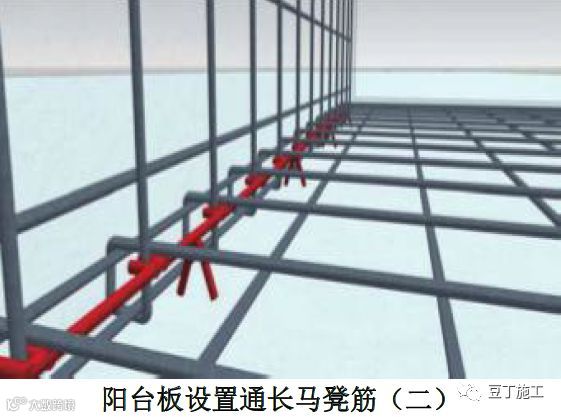15、住宅工程的栏板可采用带定位卡的钢筋马凳对楼板上层钢筋和栏板主筋定位,长度可以与栏板通长,施工时,将定位筋放置在阳台楼板内外侧双排筋之间。