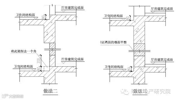 (4)厨房、小降板卫生间和普通厅房之间的梁一般做成缺口梁,梁顶标高同普通厅房的结构板标高。