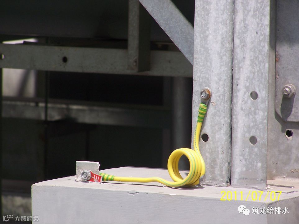 建筑物顶部的避雷针,避雷带等必须与顶部外露的其他金属物体连成一个整体的电气通路,且与避雷引下线连接可靠,女儿墙上避雷带直线部分制作支持件高度控制在10mm,高度一致,弯曲半径是园钢直径12D, 搭接焊长度扁钢为扁钢宽度的2倍,不少于三面施焊, 园钢为直径的6倍,双面施焊,测试点标高0.3m—0.5m,为了观感要求.面扳宜用地扦型盖扳,并编号,标识。