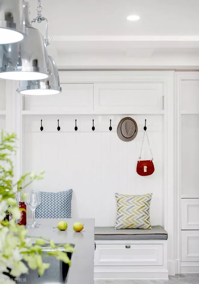 如果家里常住的人数不多的话,更建议只装隔板架,其它的比如板凳或挂钩就不要布置了,直接留白,这样既可以保持空间的通透,整个空间的视觉也会有扩充的效果。