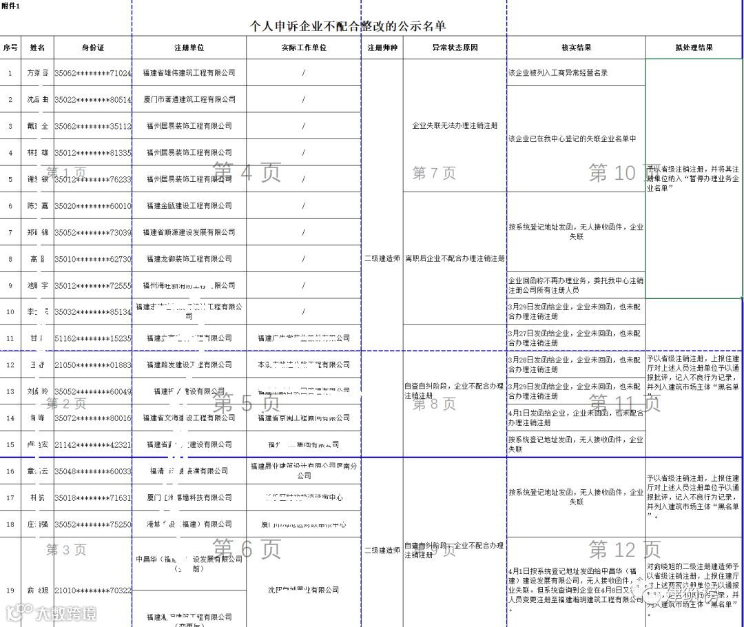 2、自查自纠期间,个人承认挂证,因挂证单位不配合整改导致甘军等9人(第10-18号)无法办理注销注册业务的,经研究决定,拟对上述9人的二级建造师注册证书予以省级注销,上报省住建厅对上述人员注册单位予以通报批评,记入不良行为记录,并列入建筑市场主体“黑名单”。