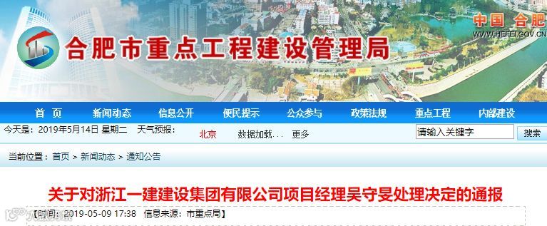 5月9日,合肥市重点局发布通报,对一施工单位项目经理吴某旻点名批评,要求立即撤职并纳入“黑名单”。