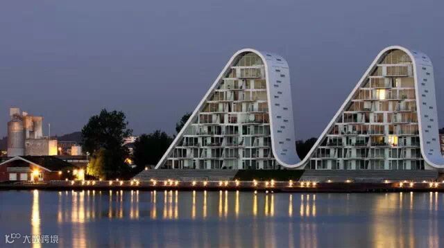 荷兰瓦埃勒小镇上的“波浪大厦”白天像在峡湾水面上的波浪,晚上像被灯光照明的山峰。