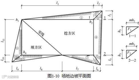 了保证挖方土壁和填方区的稳定和施工安全,场地挖方区和填方区的边沿都需要做成边坡,其平面图如图1-10所示。